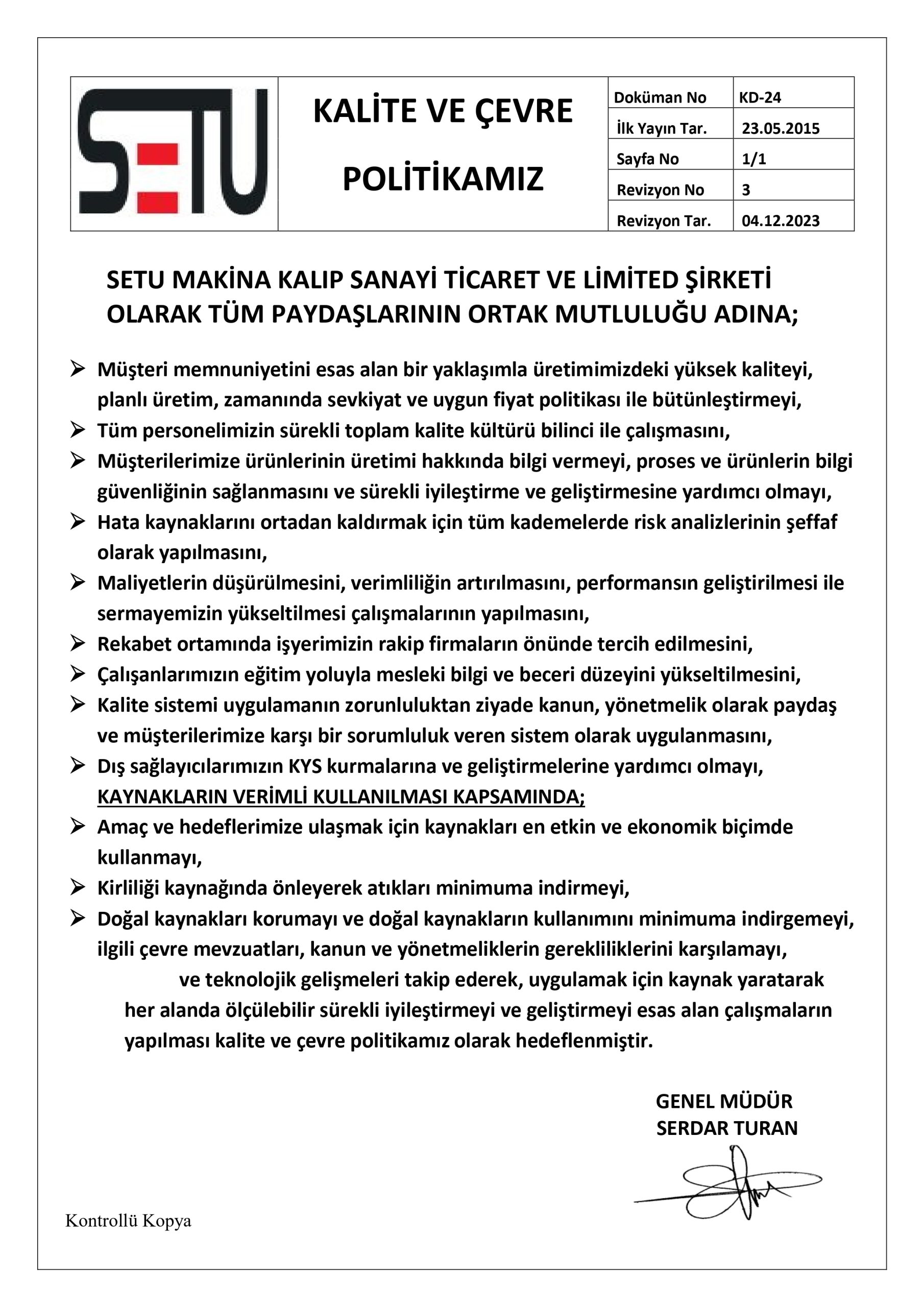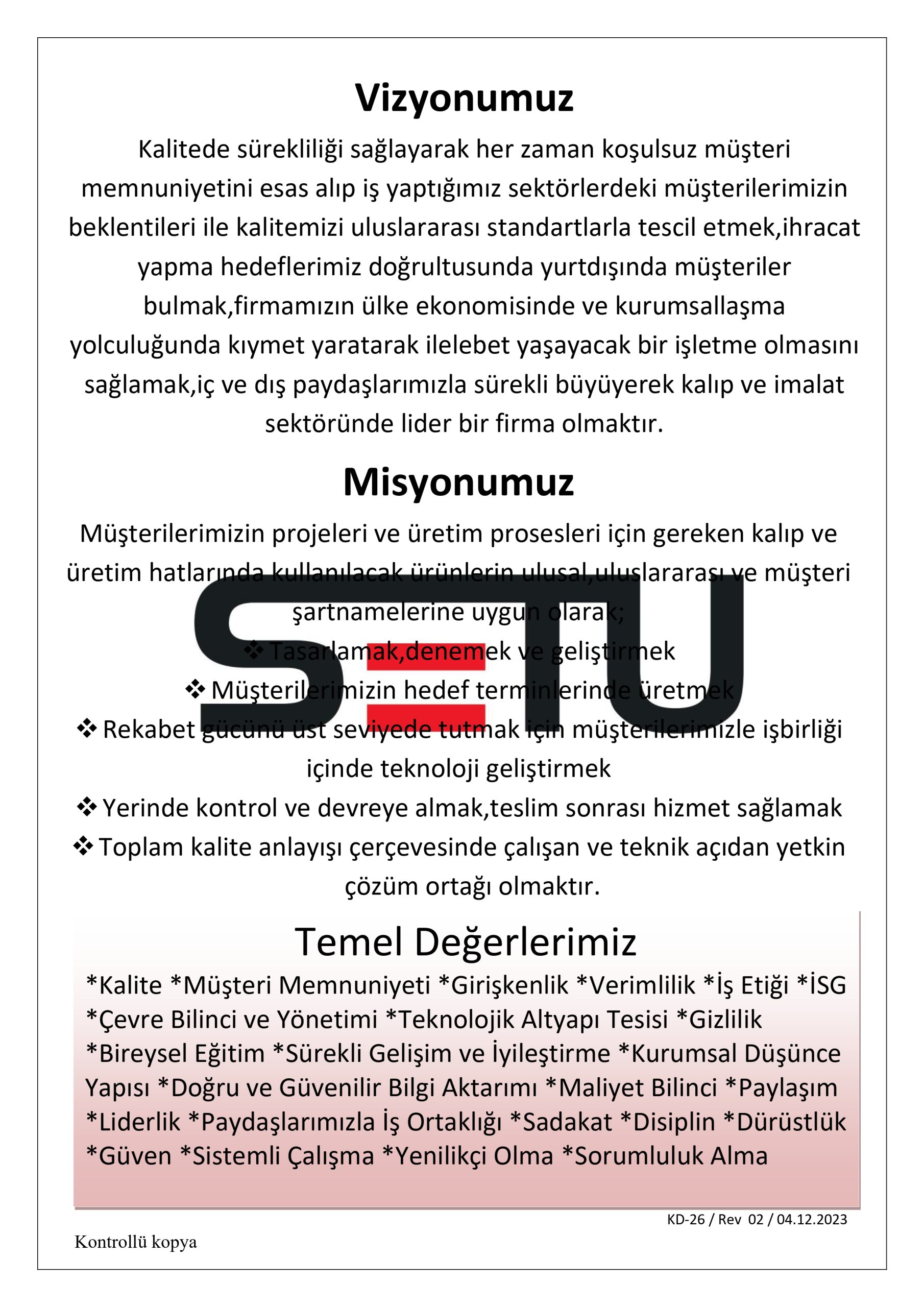 Her an, her yerde ve her aşamada koşulsuz müşteri memnuniyetini esas almak, paydaşlarımızla birlikte kalitenin bir yaşam biçimi olarak, ilerleme ve gelişmenin alt yapısı olmasını sağlamak ve bu anlayışı yaygın hale getirmek,şirketimizin Türk Ekonomisinde, iş hayatında, iş ahlaki ve kurum kültürü normlarında kıymet yaratarak ilelebet yaşayacak bir işletme olmasını amaçlayan ilkelere bağlı kalmak, müşterilerimizle ve tedarikçilerimizle hedef ortaklığımızı devam ettirmek, faaliyet alanlarımızda sürekli büyüyerek sektörümüzde sürekli öncü ve lider firma konumunu hedefleyerek orada kalıcılık sağlamak.